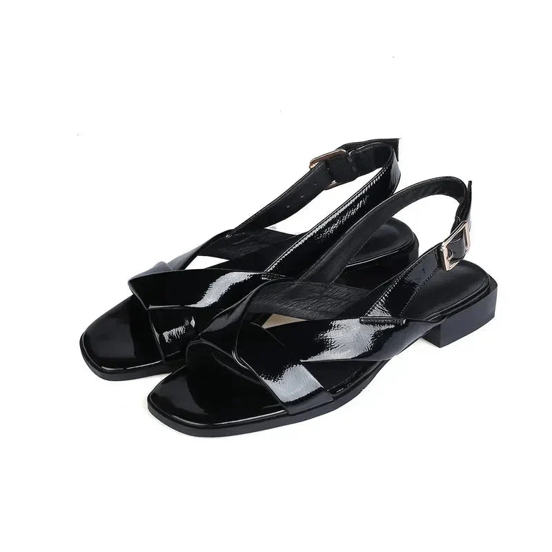Skórzane sandały na niskim obcasie z kwadratowym noskiem dla eleganckiego i wygodnego wyglądu. Idealne do pracy i na czas wolny latem. Dostępne w kolorze czarnym i beżowym.