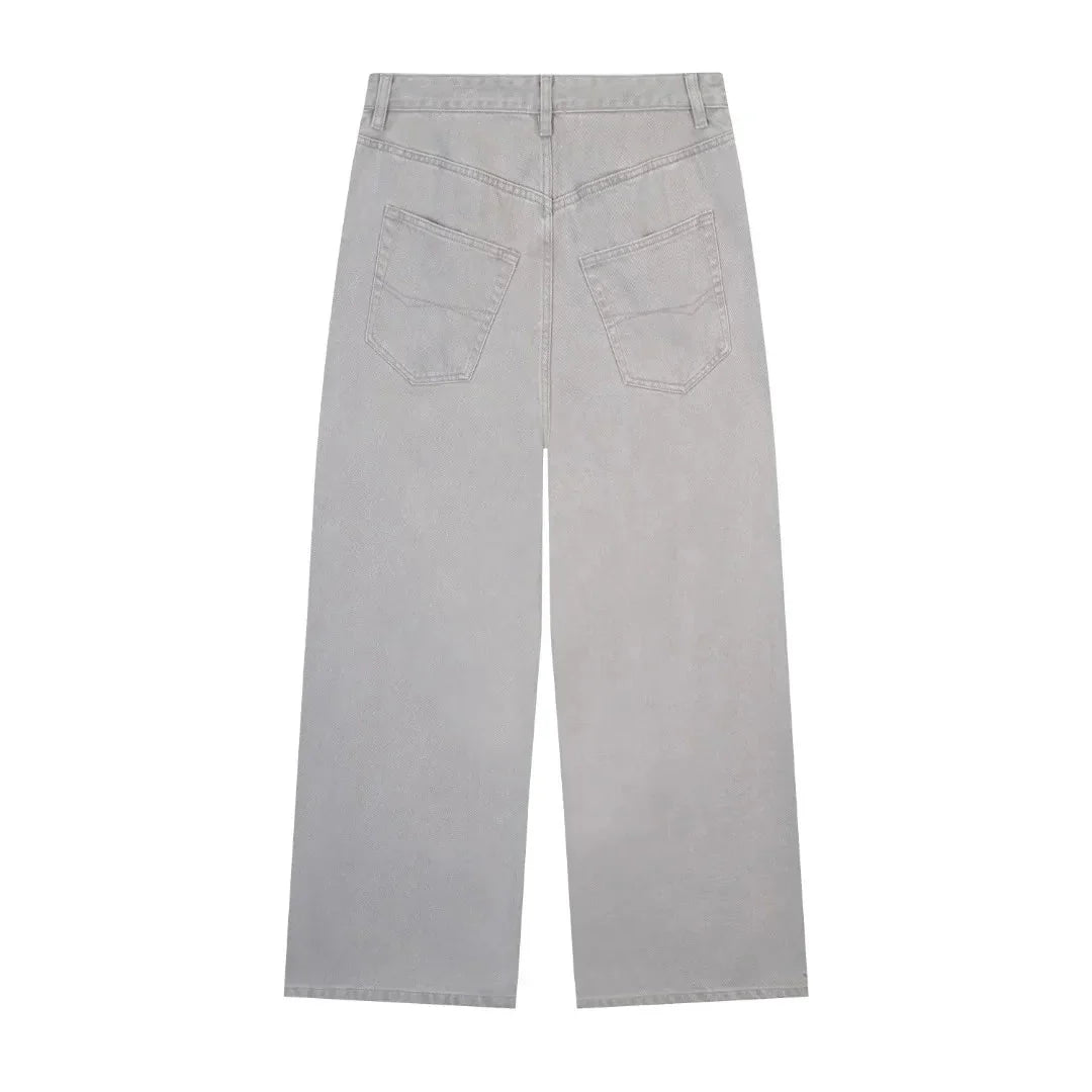 Szare jeansy z denimu z wysokim stanem i szerokimi nogawkami. Wygodny krój i nowoczesny wygląd, idealne na jesień 2024. Doskonały wybór do casualowych stylizacji i swobodnego streetwearowego stylu.