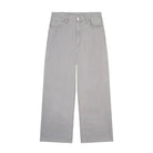 Szare jeansy z denimu z wysokim stanem i szerokimi nogawkami. Wygodny krój i nowoczesny wygląd, idealne na jesień 2024. Doskonały wybór do casualowych stylizacji i swobodnego streetwearowego stylu.