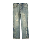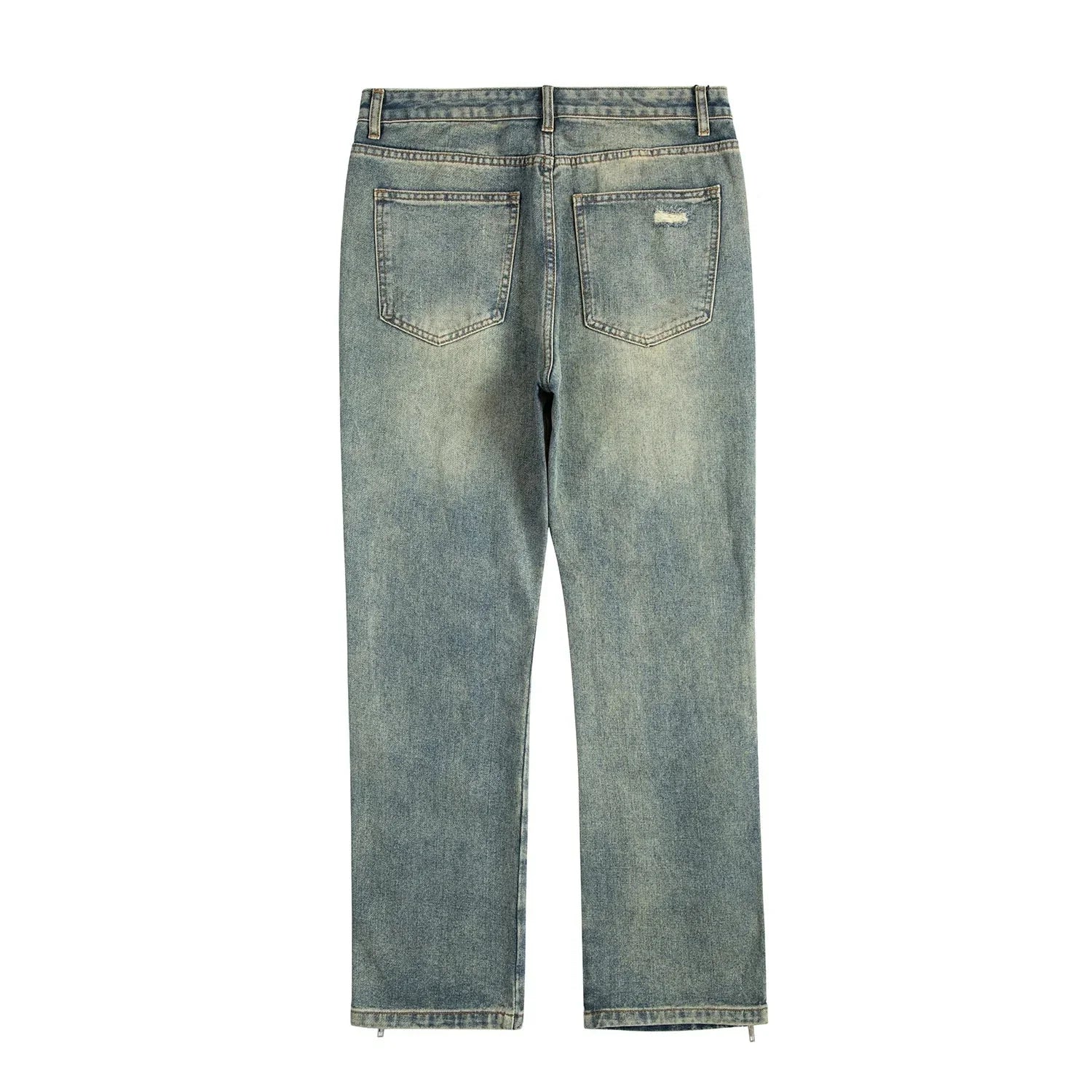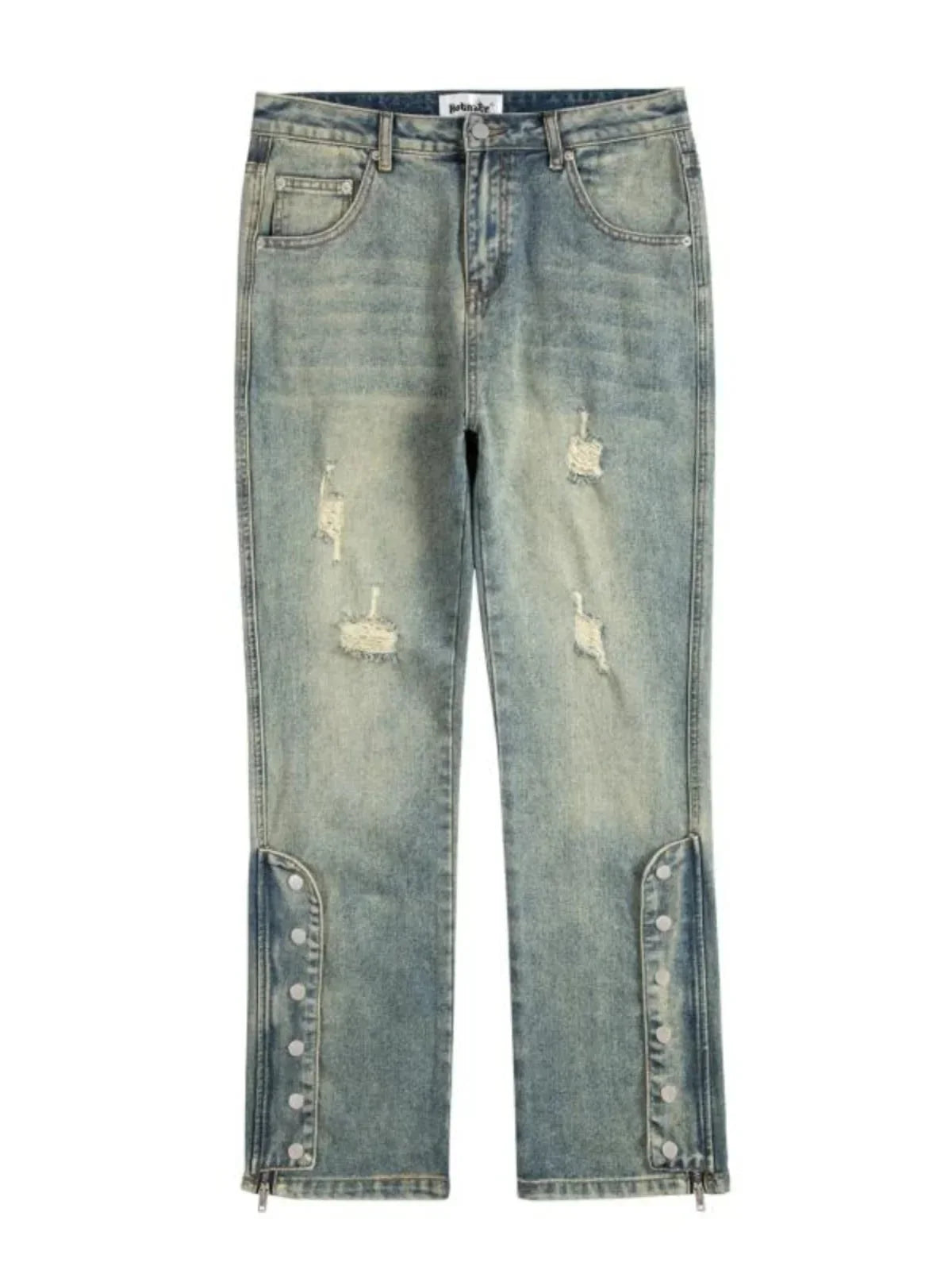 Streetwearowe dżinsy z vintage efektem sprania, bocznym zamkiem i przetarciami. Zwężany krój zapewnia nowoczesny i wygodny wygląd. Idealne na casualowy, miejski styl.