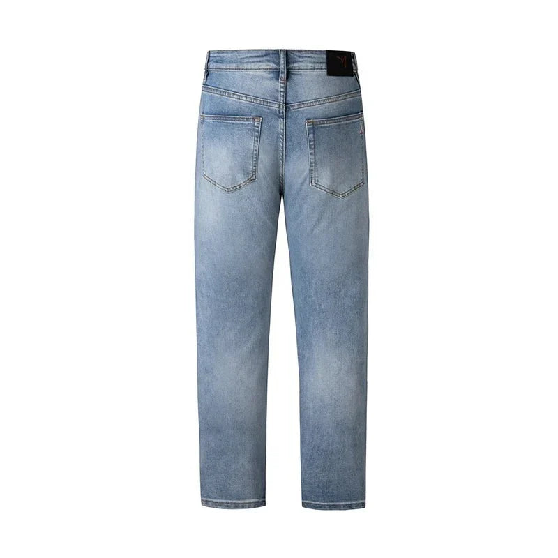 Jasnoniebieskie jeansy slim fit ze stretchem dla mężczyzn. Te wysokiej jakości proste jeansy łączą wygodę z nowoczesnym stylem i są idealne zarówno do casualowych, jak i półformalnych stylizacji.