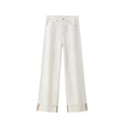 Białe dżinsy z wysokim stanem i szerokimi nogawkami. Klasyczny fason o vintage wyglądzie z podwiniętym brzegiem, idealny do swobodnego, streetwearowego stylu. Świetnie pasują do każdej stylizacji, zapewniając nowoczesny i świeży wygląd.