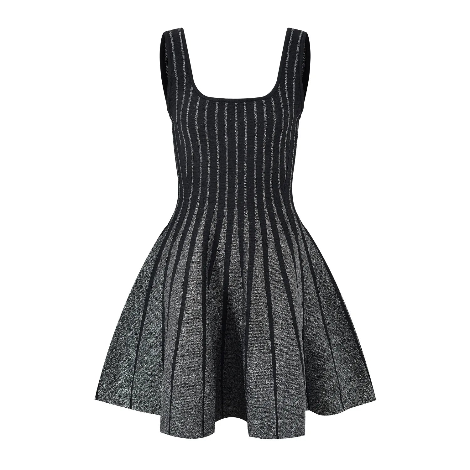 Stylowa sukienka o kroju w kształcie litery A, bez rękawów, z okrągłym dekoltem i delikatnym wzorem w paski. Doskonały wybór na co dzień oraz na oficjalne okazje.