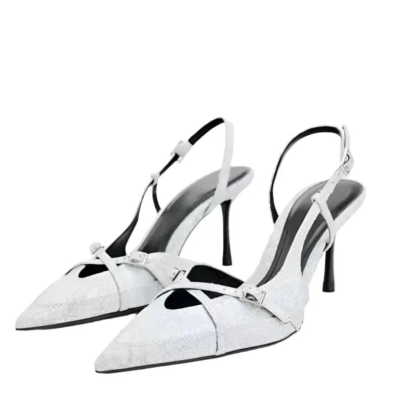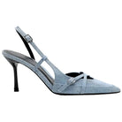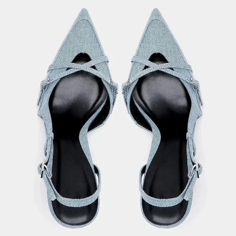 Stylowe czółenka z denimu o fasonie slingback i szpiczastym nosku. Te wysokie obcasy dodadzą modnego i eleganckiego charakteru każdej stylizacji – idealne zarówno na co dzień, jak i na bardziej formalne okazje.